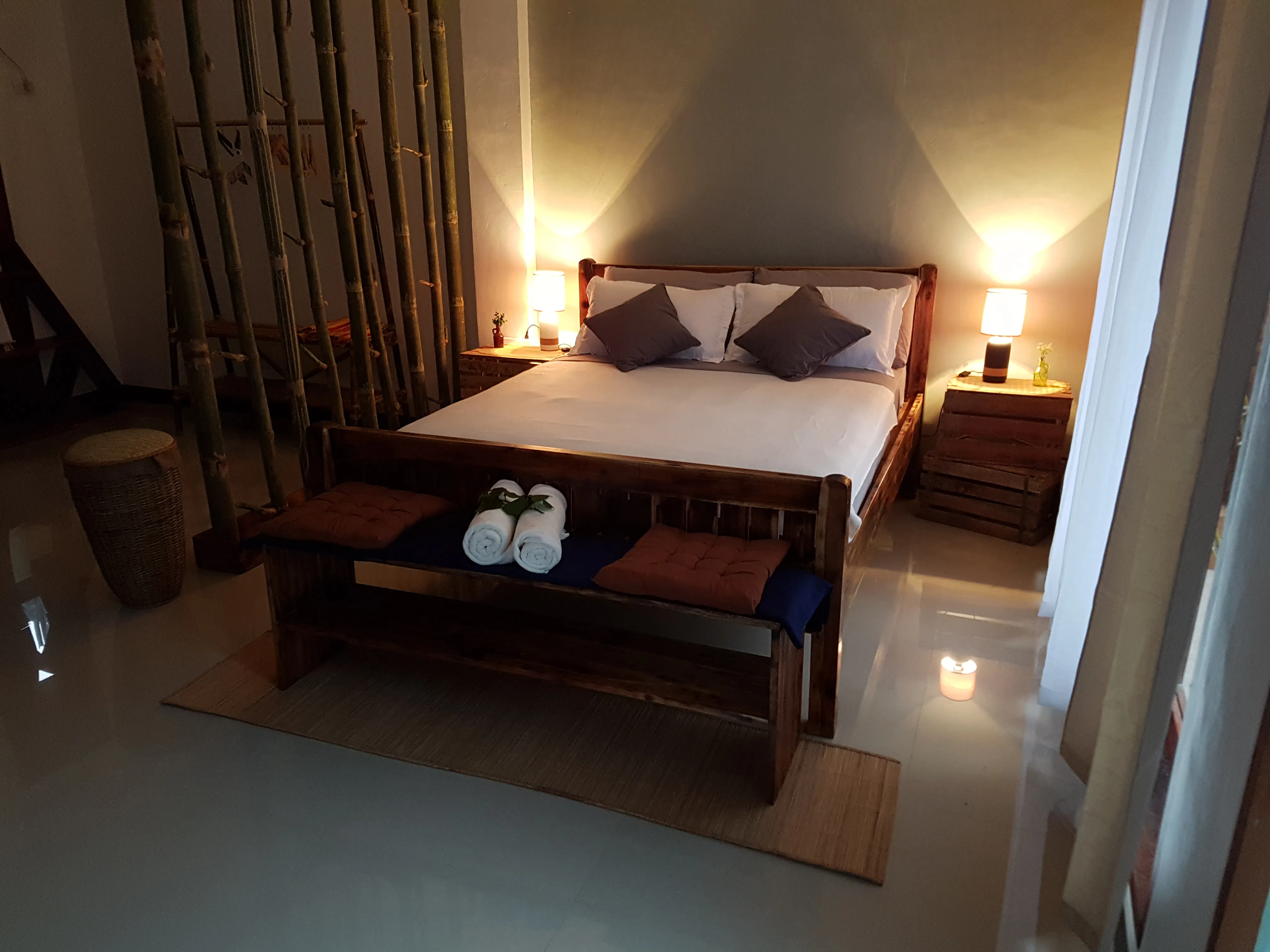 40sqm room with Queen size bed in the bedroom, Window Type Air-con with remote, Native wardrobe with safe box, private toilet with hot water, amenities, towels, fitting area and work table, Minibar, terrace with dinning table and garden view.